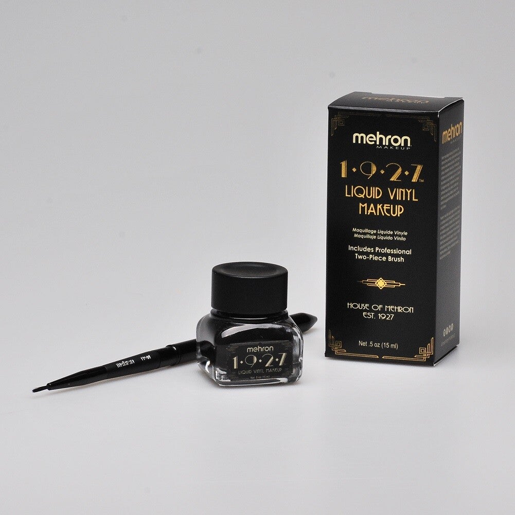 From the House of Mehron Est. 1927. Our jet black, paintable liquid makeup delivers a high shine vinyl-like finish giving you an intense look that lasts. 1927's unique water and smudge resistant formula retains its glossy shine and lets you create endless textures and designs for face and body. Includes a professional two-piece brush that's perfect for creating the finest details. Our ultra long-wearing liquid vinyl can be used for the most precise eye-lining detail and for elaborate body painting creations. Let your creativity go wild, the options are infinite! Stored in a great retro 15 ml ink well bottle!